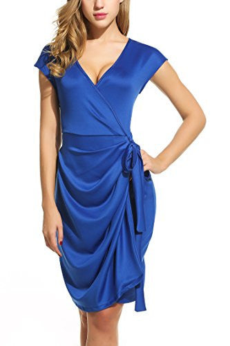 Women's Classic Cap Sleeve V-Neck Draped Tie-Belt Cocktail Wrap Dress