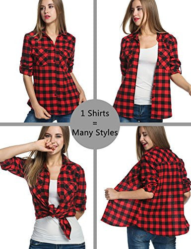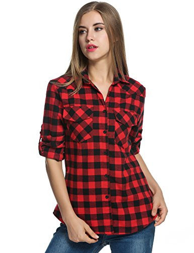 Zeagoo Women's Roll Up Sleeve Casual Loose Boyfriend Plaid Button Down Shirt