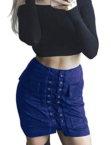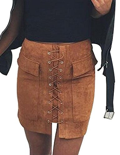 Allegrace Women Sexy Lace Up Bodycon Faux Suede Fashion Big Pocket Mini Skirt