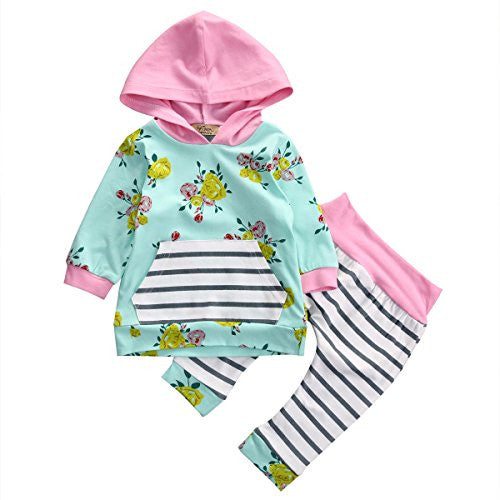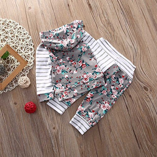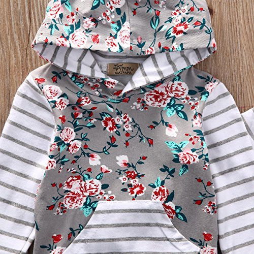 Baby Girl 2pcs Set Outfit Flower Print Hoodies with Pocket Top+Striped Long Pants