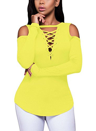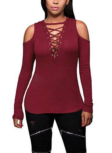 FARYSAYS Women's Sexy Cold Shoulder Blouse Lace-Up Ribbed Tops