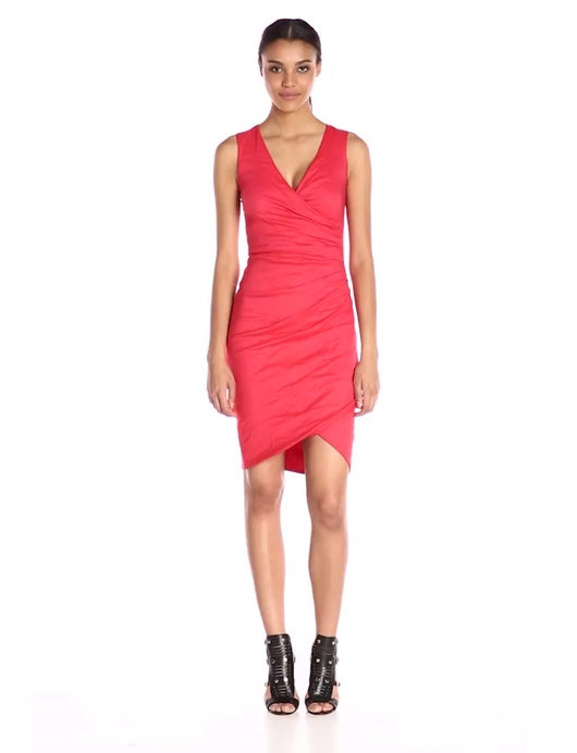 Faux wrap detail and asymmetric hem add edge to this flattering dress.